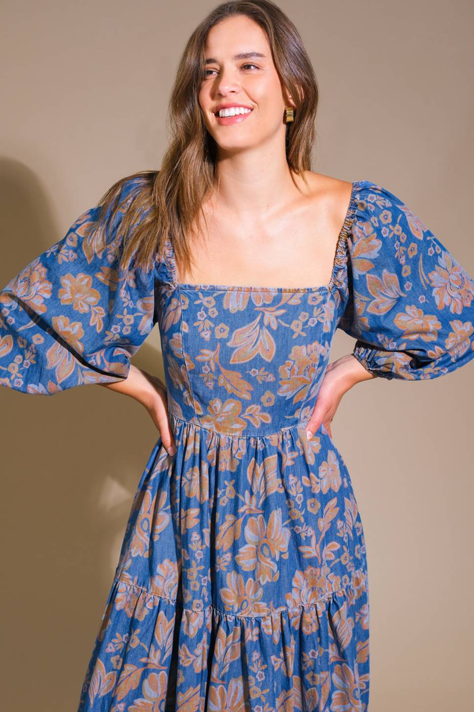 A printed denim midi dress featuring a square neckline, 3/4 sleeves, tiered skirt and smocked back bodice