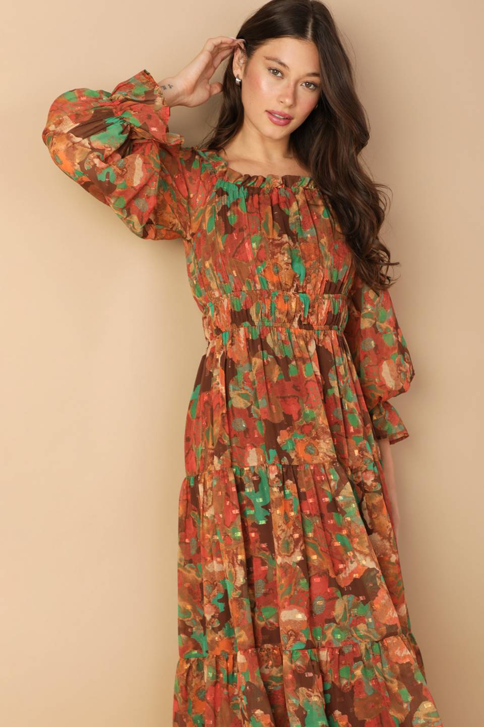 A printed woven midi dress featuring off shoulder neckline with ruffled edge, long sleeve with ruffled cuff, double elasticized waist and tiered skirt