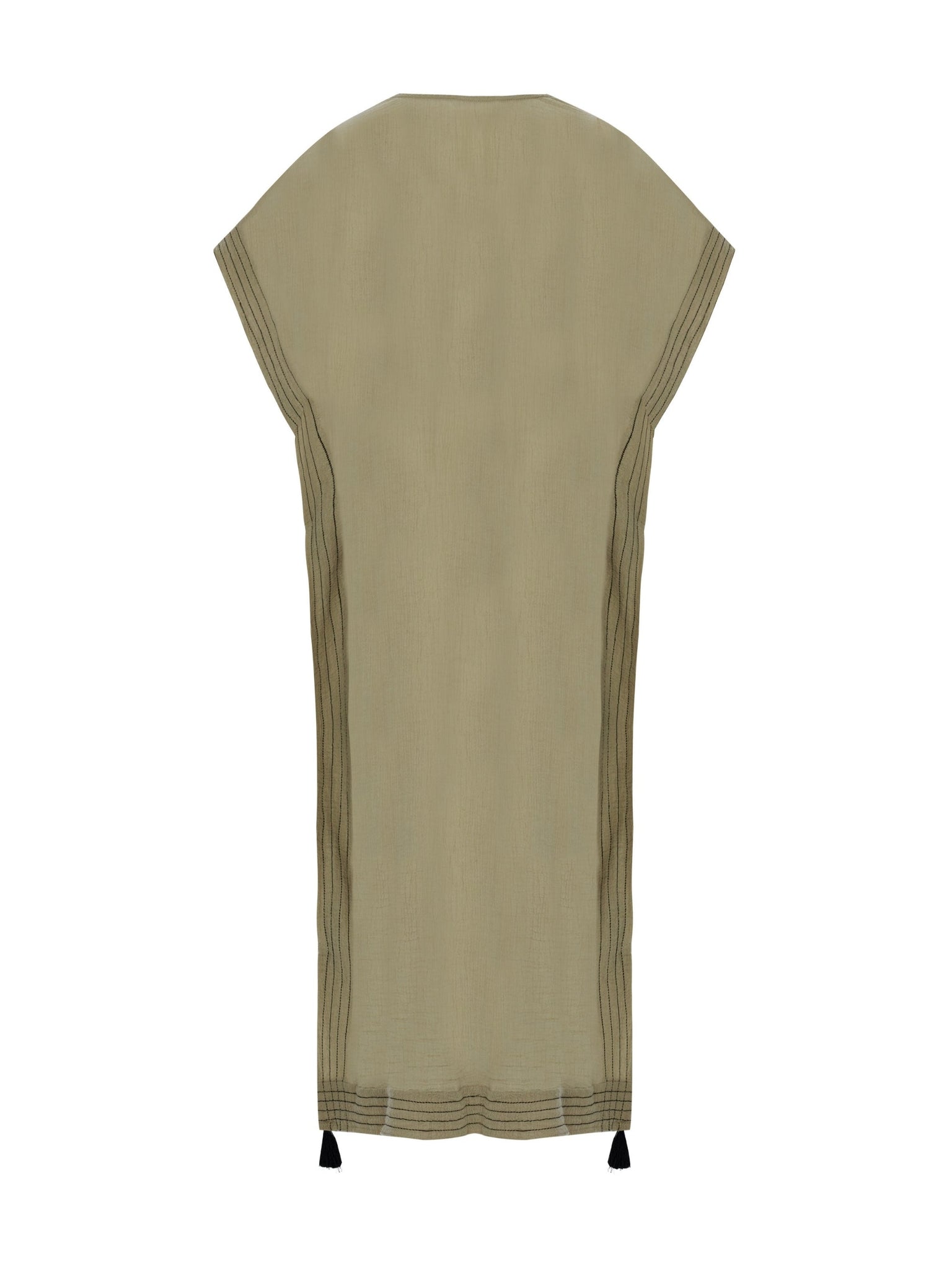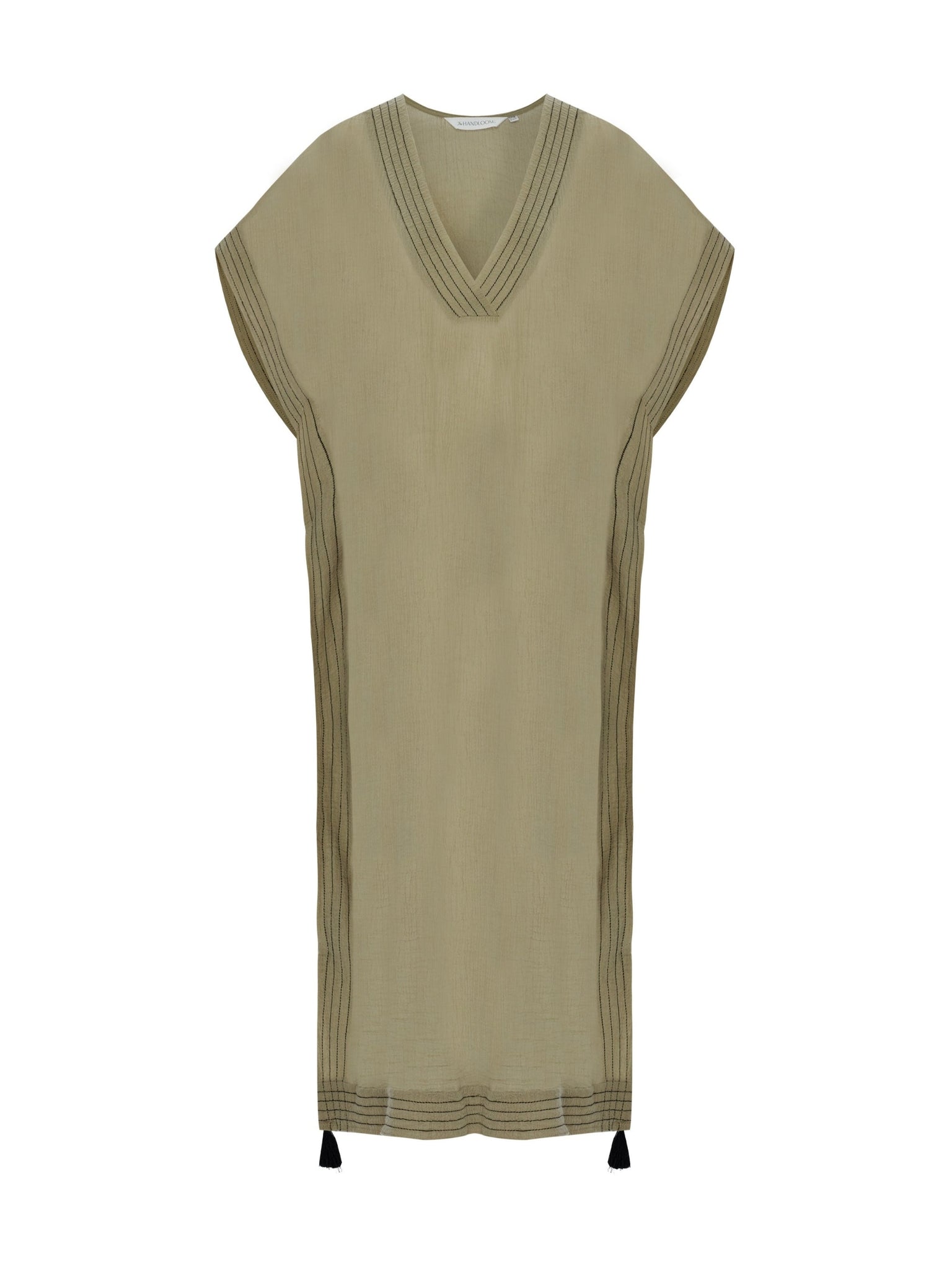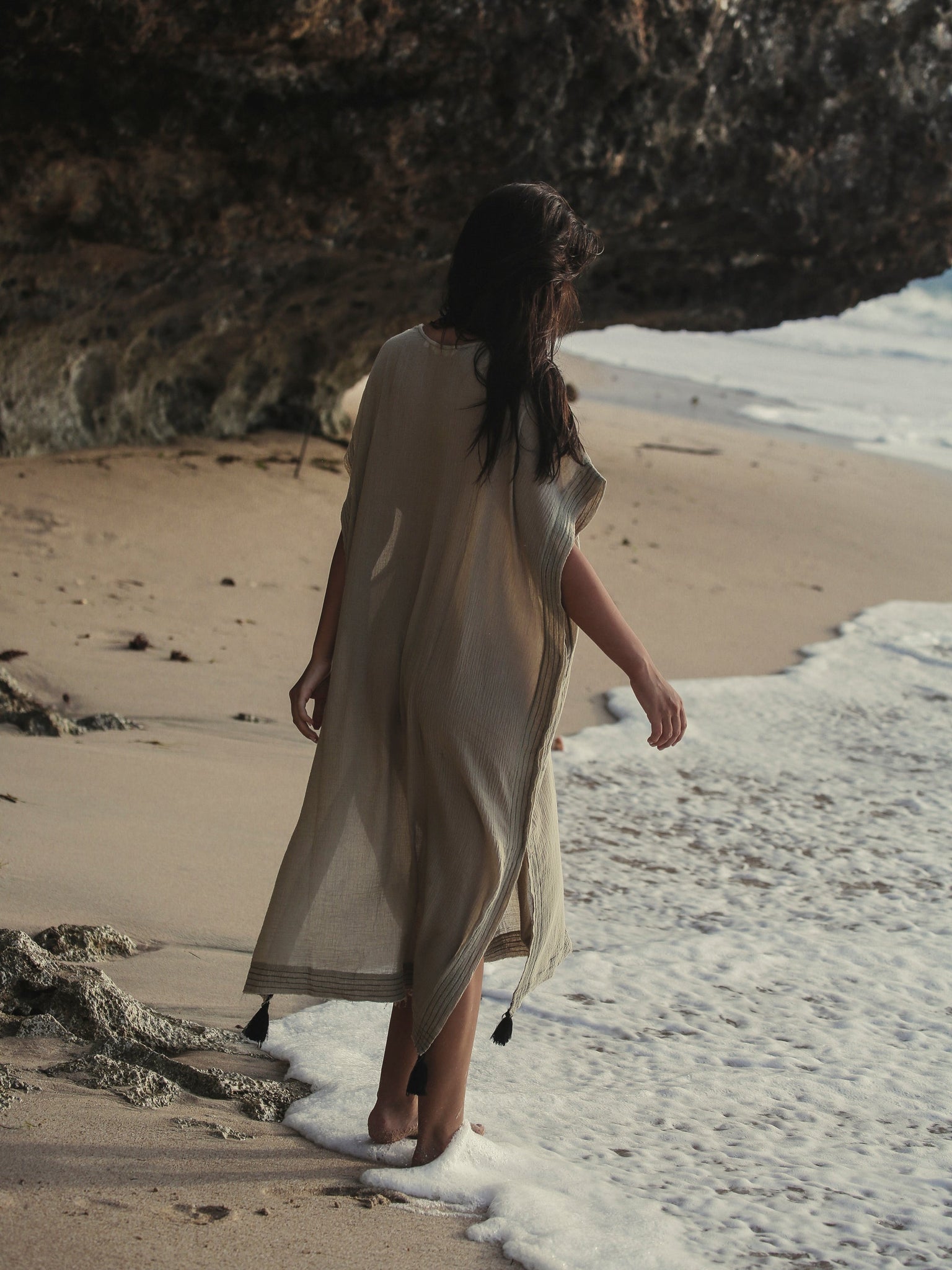 The Ela Kaftan Khaki Green is one of our best seller, and it’s easy to see why. This stylish, gauzy gown is made of lighter-than-air cotton—undeniably our best fabric. Breathable fibers and a flowing cut create a sophisticated statement while sky-high side slits let you show a little leg. The hem is accented with oversized tassels. This kaftan is simple, luxurious, and perfect for making an entrance.