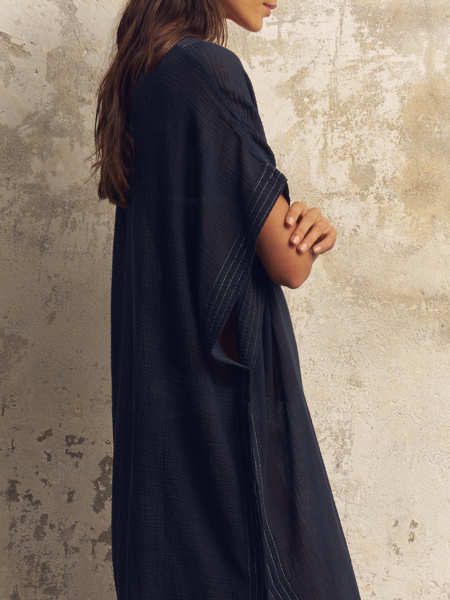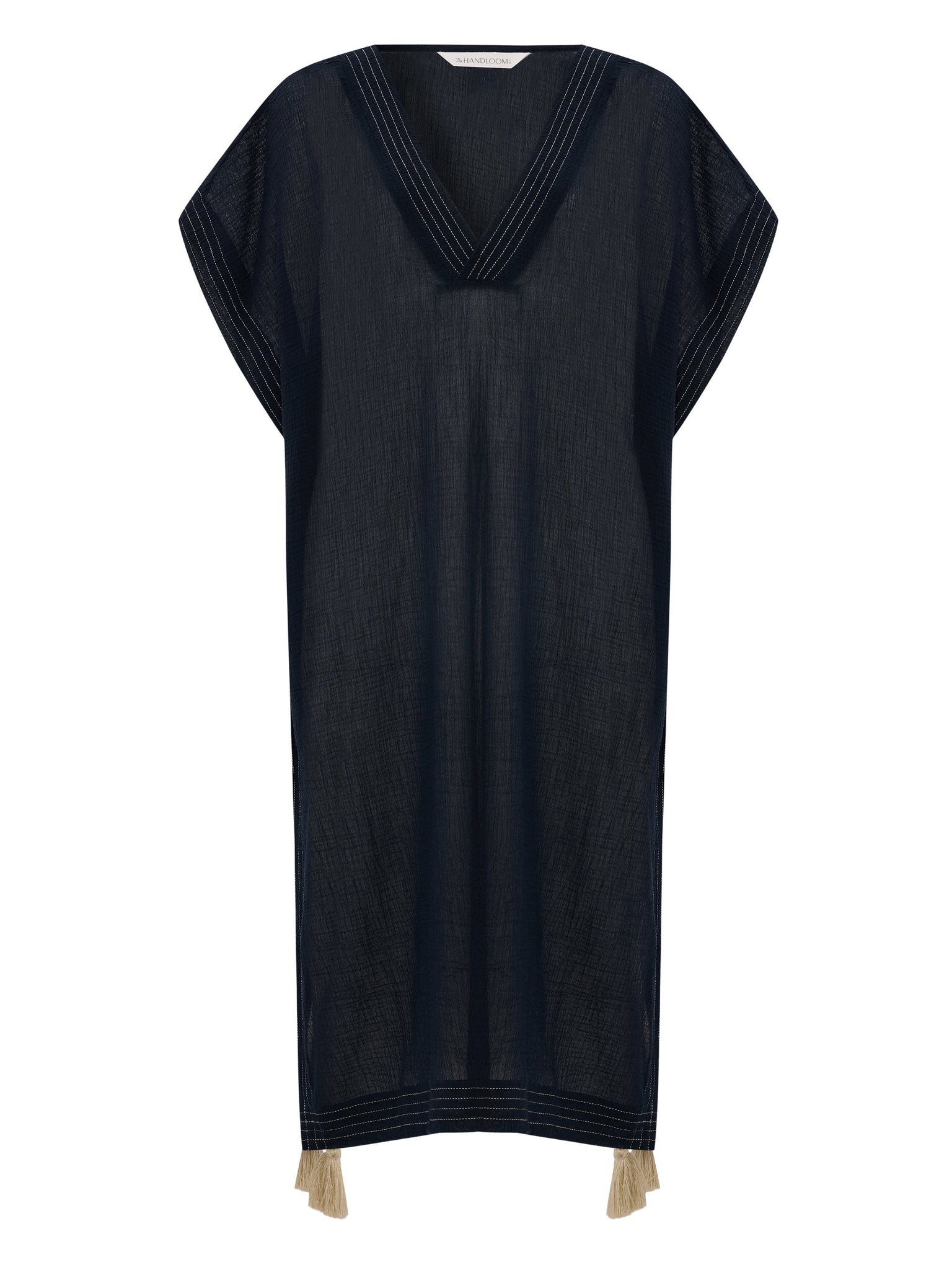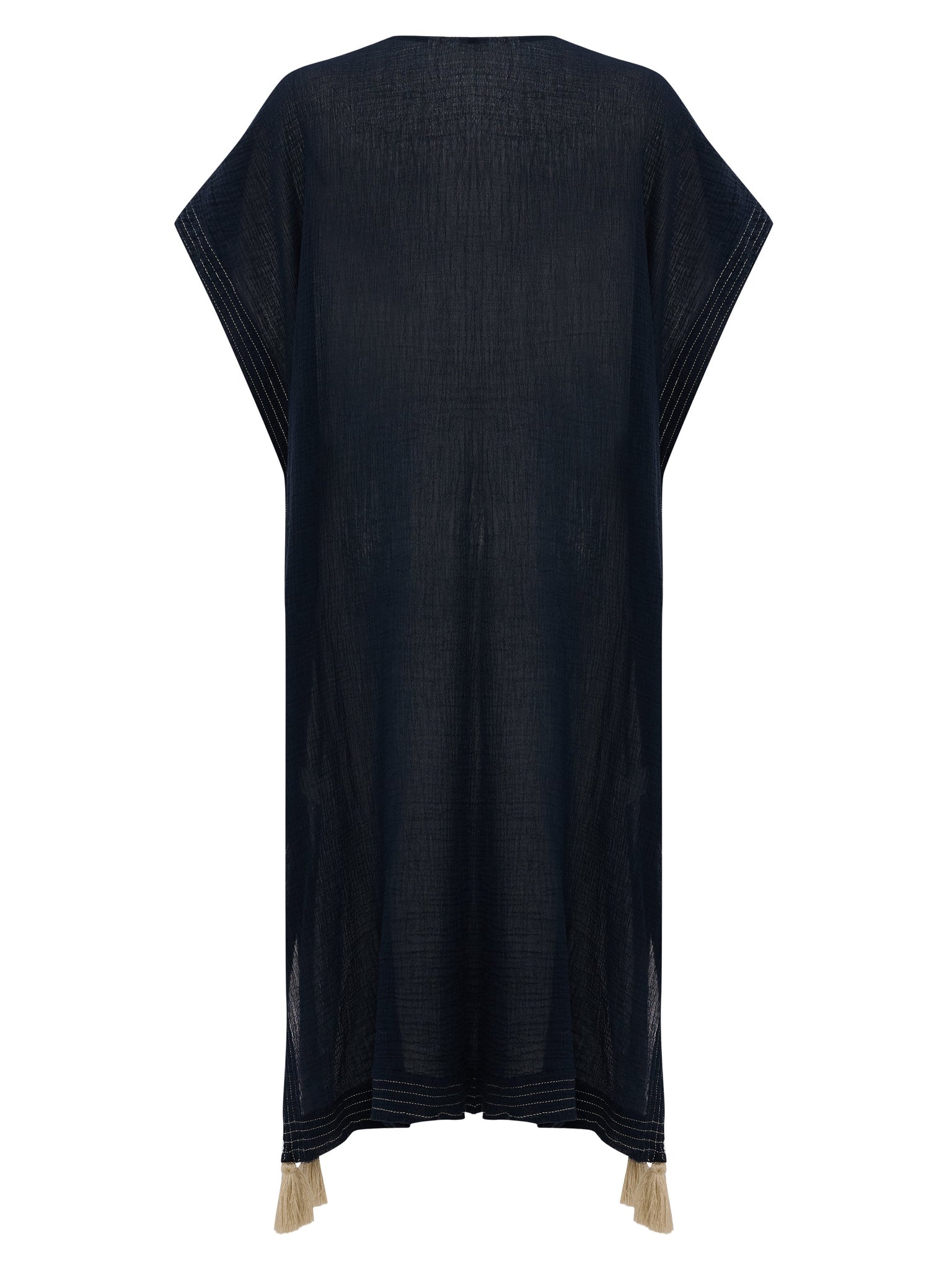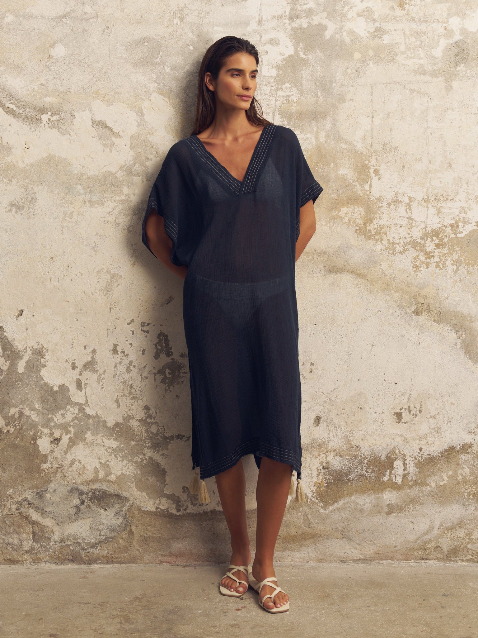 The Ela Kaftan Navy is one of our best seller, and it’s easy to see why. This stylish, gauzy gown is made of lighter-than-air cotton—undeniably our best fabric. Breathable fibers and a flowing cut create a sophisticated statement while sky-high side slits let you show a little leg. The hem is accented with oversized tassels. This kaftan is simple, luxurious, and perfect for making an entrance.