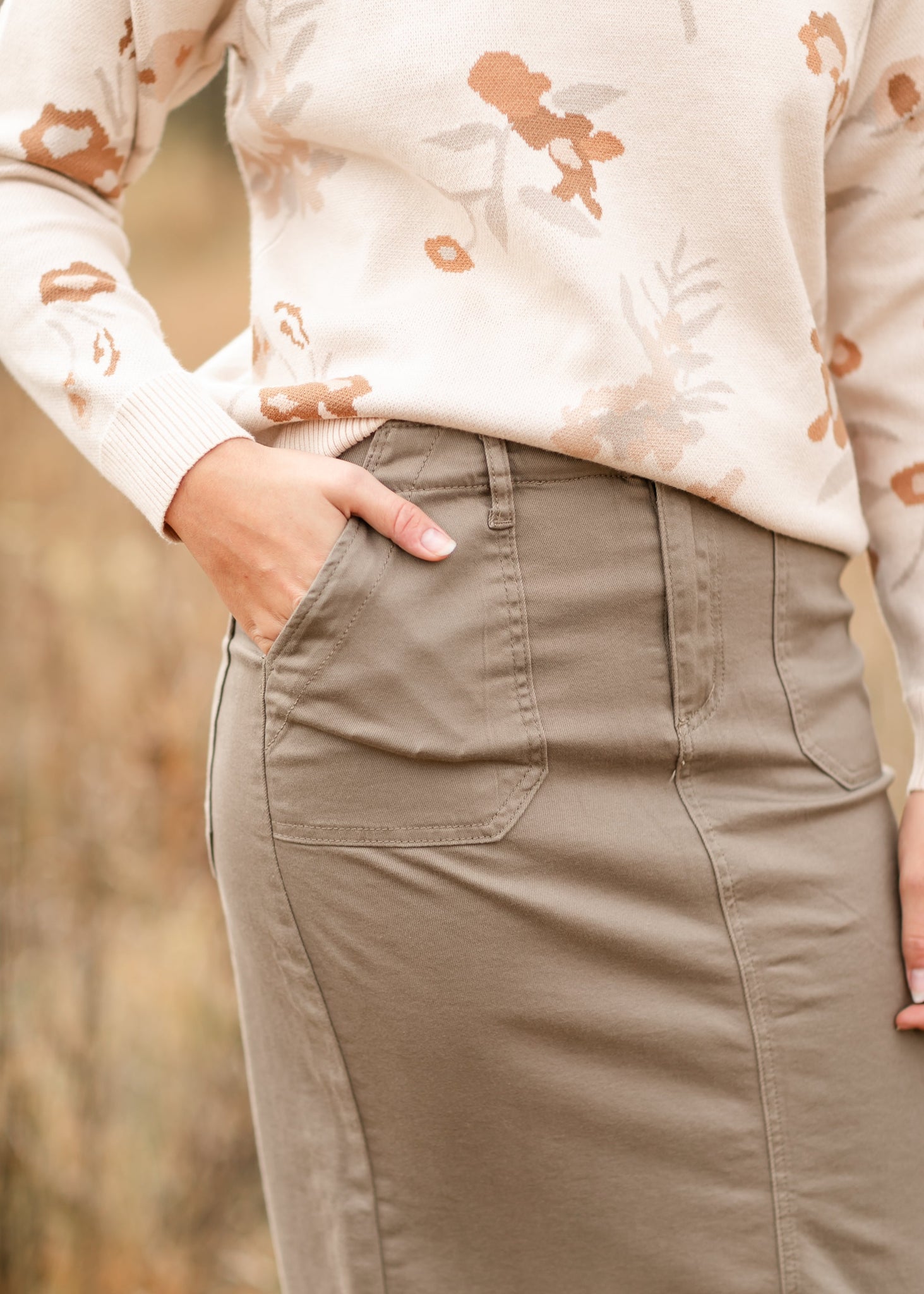 The Erica Cotton Twill Midi Skirt is an Inherit Design with a modern twist on a classic colored skirt! Designed in two lengths 26" and 31". The stretchy cotton material is also a big one on this skirt, it accommodates for different body types and includes plus sizes! The wider hem length at the bottom is intended. You will love this skirt for home, church work or play!  Pair it with one of our Essential Tees and cardigans for comfortable classic look!