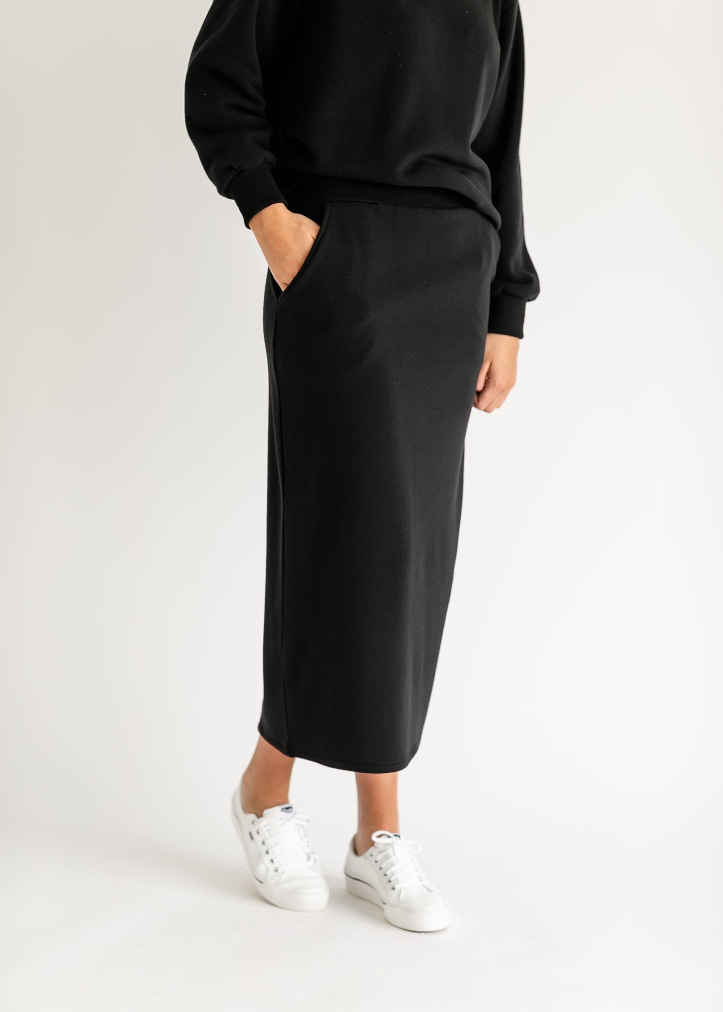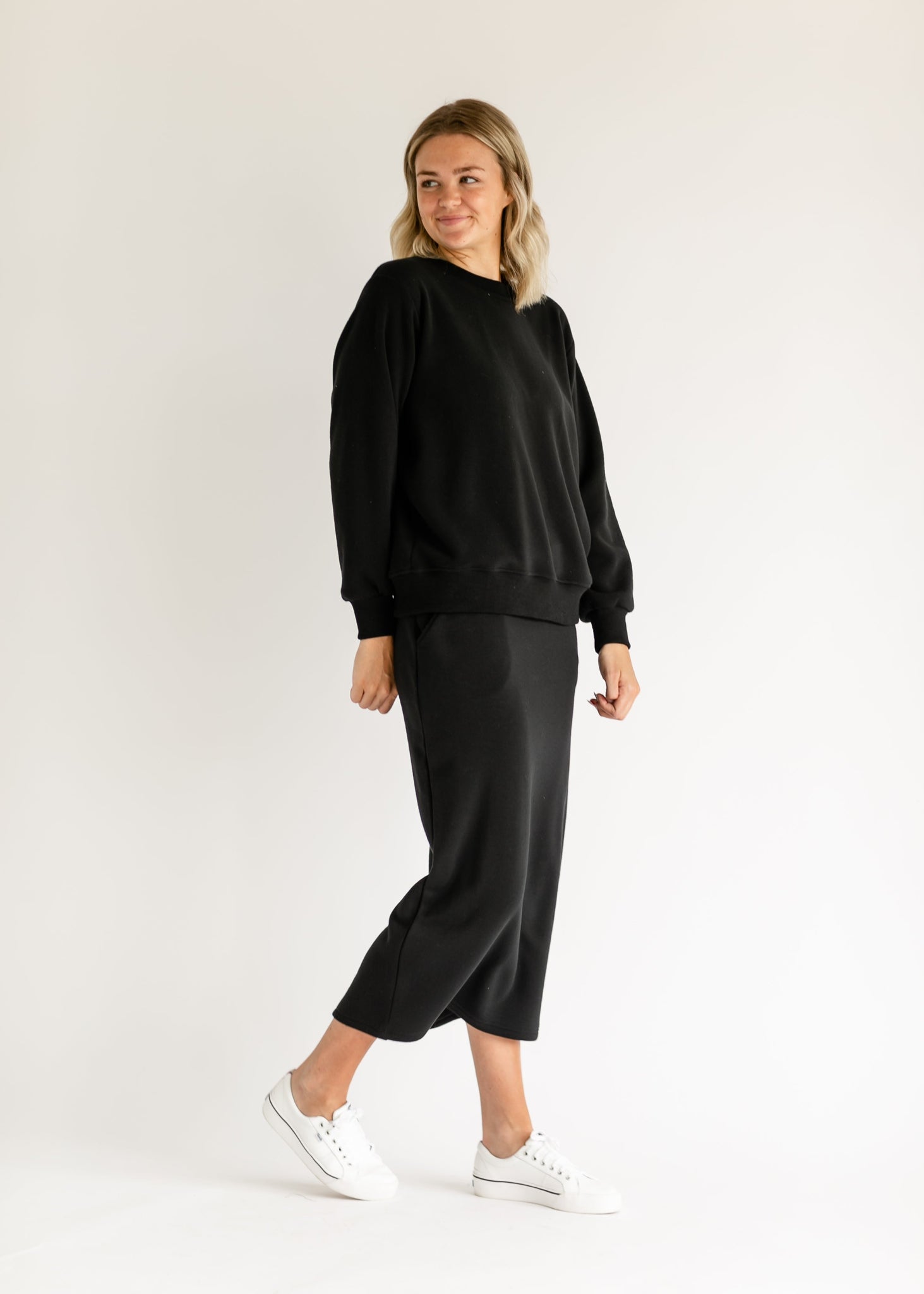 The Essential Sweatshirt Skirt Set is an Inherit Designed modest and cozy set you will love! Crafted from high-quality sweatshirt material, the top features a ribbed crewneck, and sleeve cuffs. The skirt is a midi length with a stretchy elastic waist. The neutral black color is classic and will go with all the things!