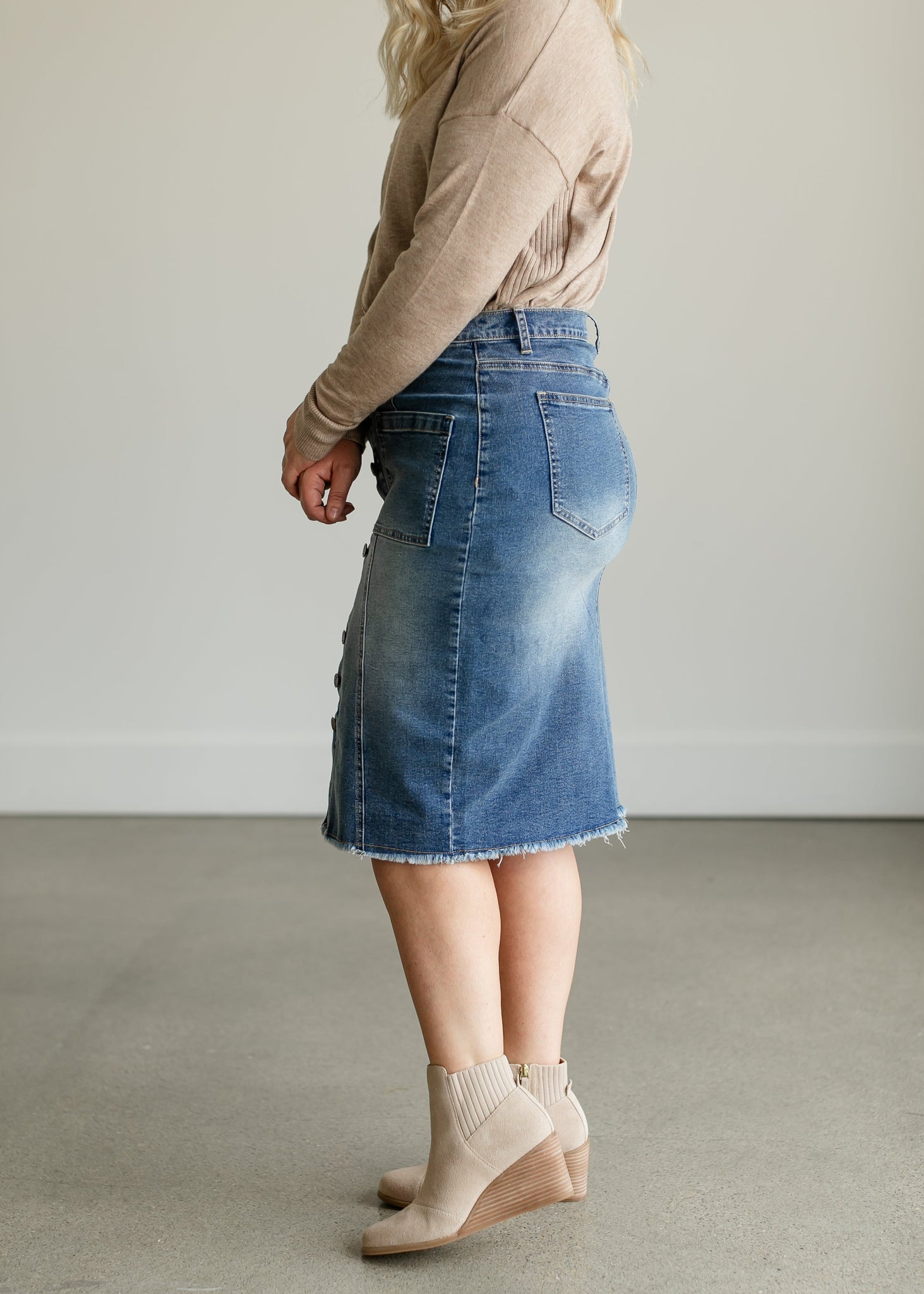 The Farrah Denim Midi Skirt is an Inherit Design that is made from a medium wash denim that is extra stretchy! Designed with Megan Fox Unlocked, This midi skirt features button details down the front of the skirt with three functioning buttons at the top. There are functioning patch-style pockets on the front and a raw hem detail that finishes off the skirt. This midi skirt is super stretchy so you will feel comfortable and on-trend without compromising! Great stretch and perfect for ladies on the move!