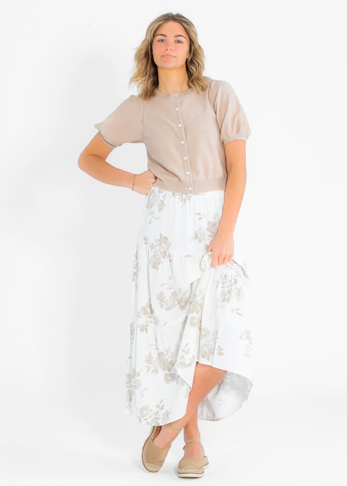 The Jill Stretch Waist Tiered Maxi Skirt features a white base with soft taupe florals in a breathable linen blend. Its flowy, tiered silhouette and stretch waistband offer a flattering, comfortable fit. Perfect for warm days or pairing with sweaters, this made in the USA modest skirt easily pairs with neutral tops for timeless, versatile styling!