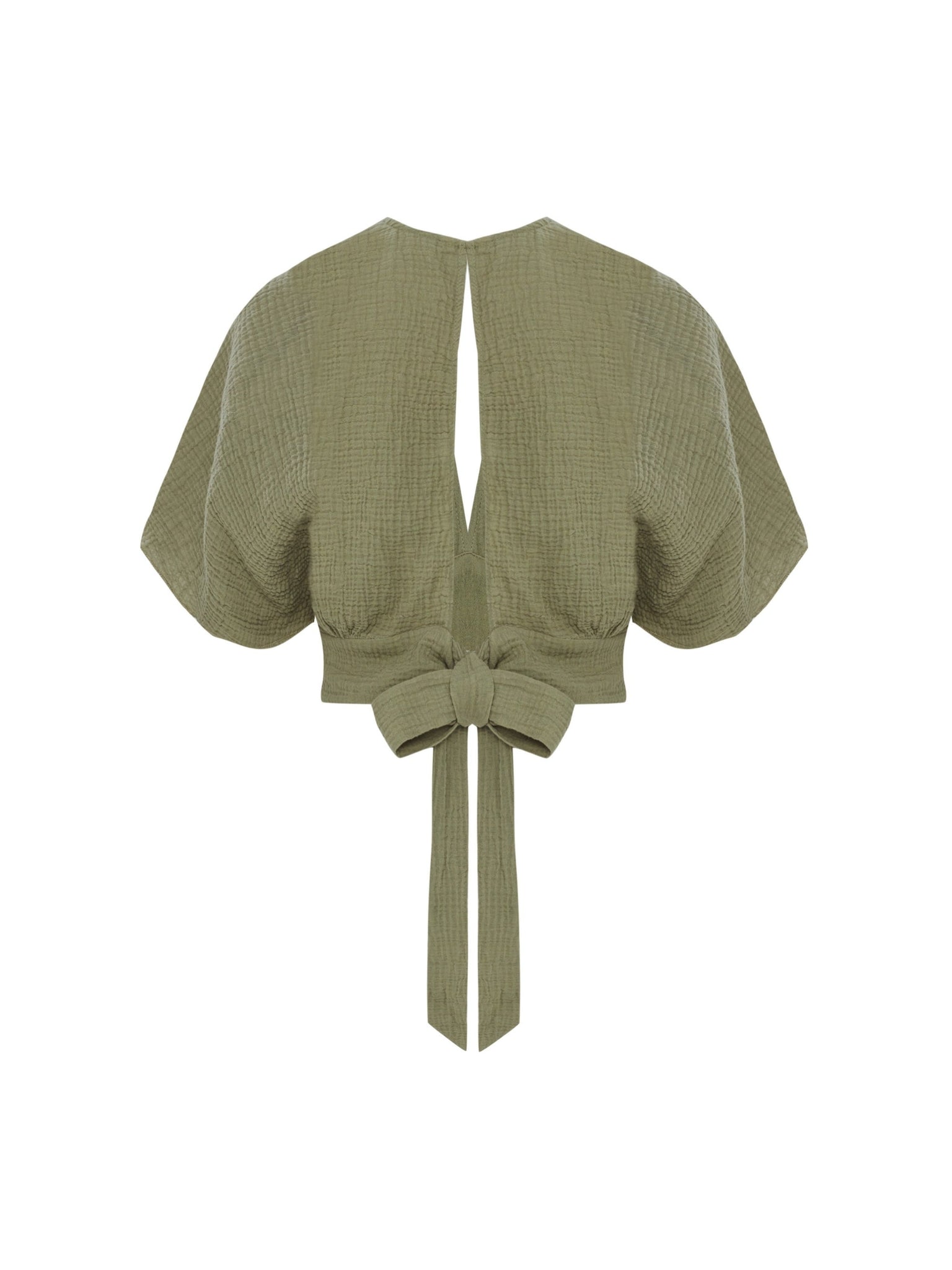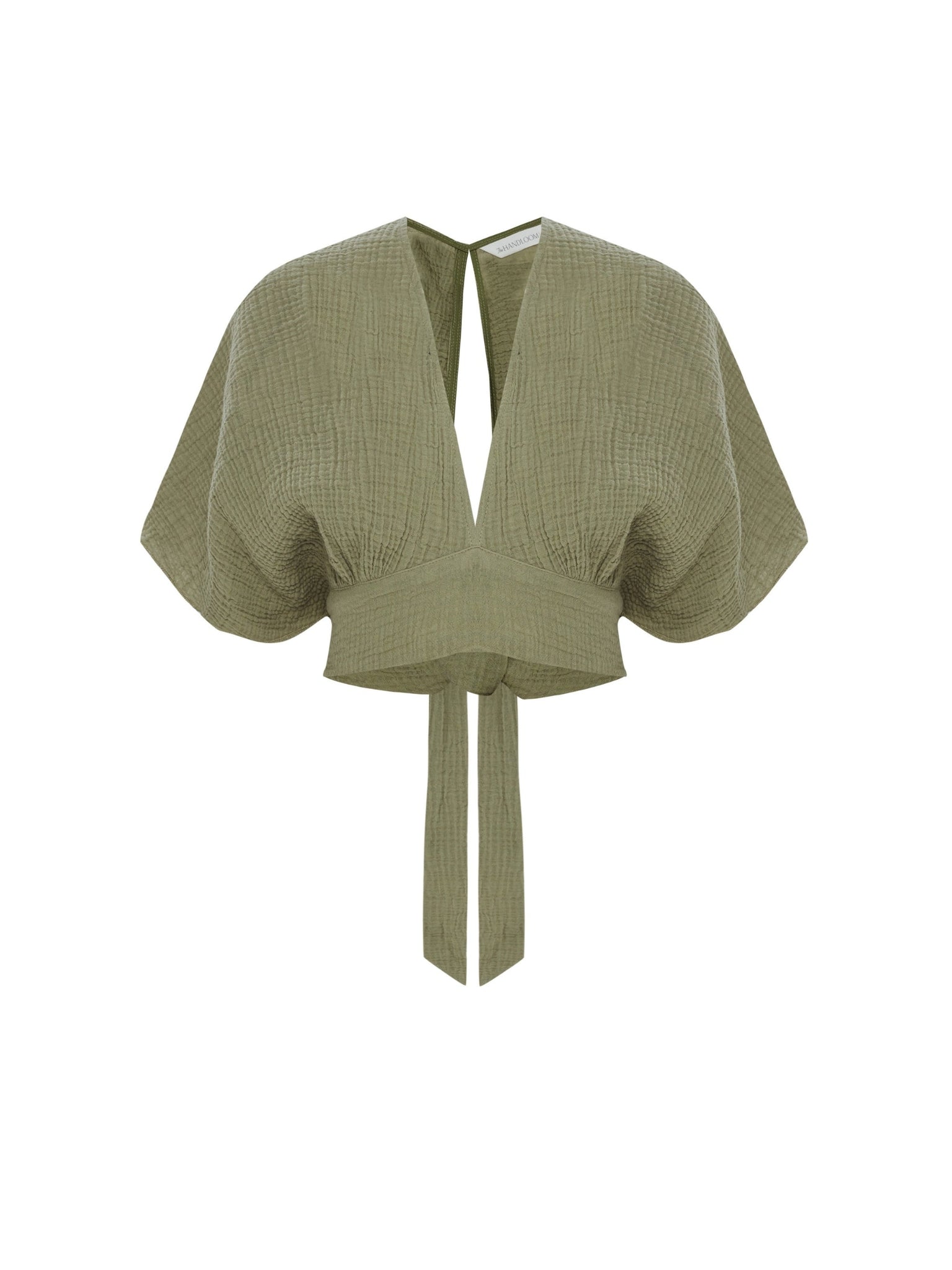 The Mare Top is a sophisticated cropped piece featuring a V-neckline that adds a touch of elegance. The self-tie waist allows for a tailored, refined silhouette, while the dramatic mid-large sleeves make a statement, lending an air of graceful charm. The sleeves are equipped with adjustable tie wraps that can be elegantly fastened at the back.