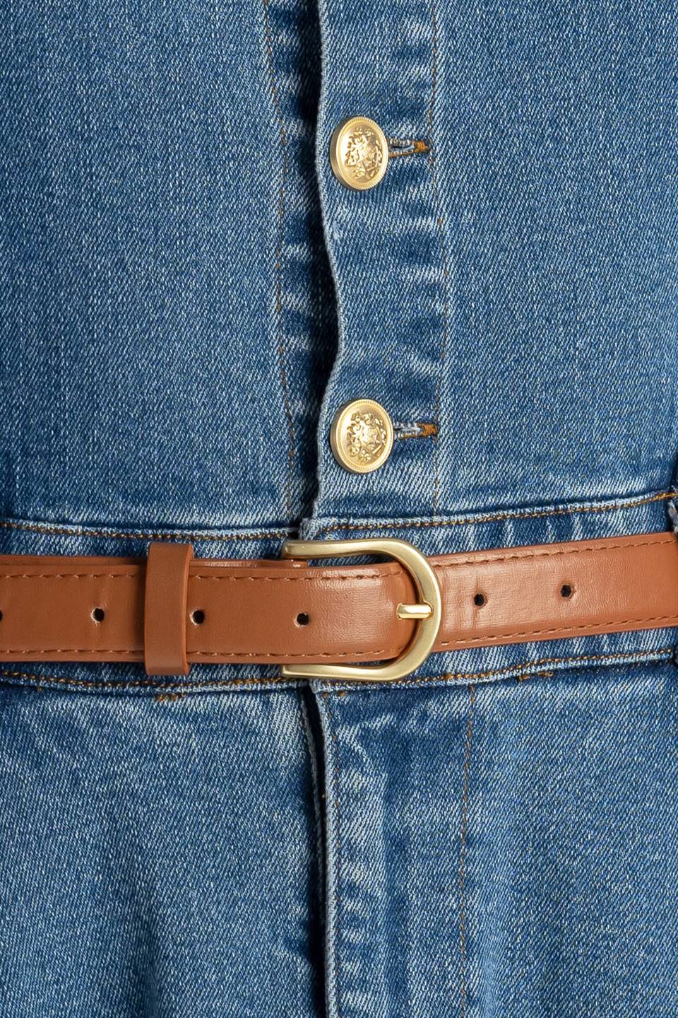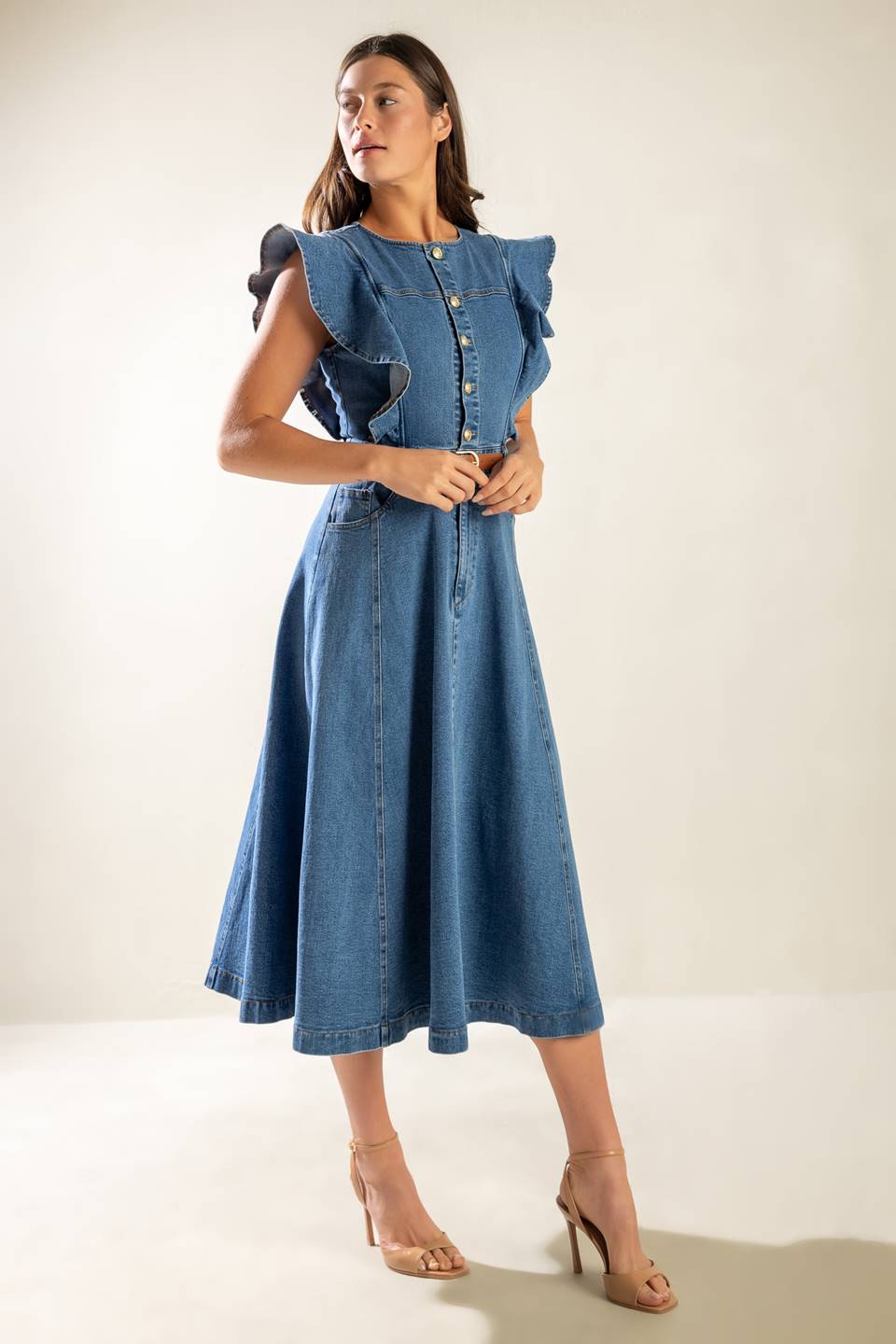 A washed blue denim midi dress featuring round neckline, short ruffled sleeve, front button/zipper closure, side pockets and full skirt.