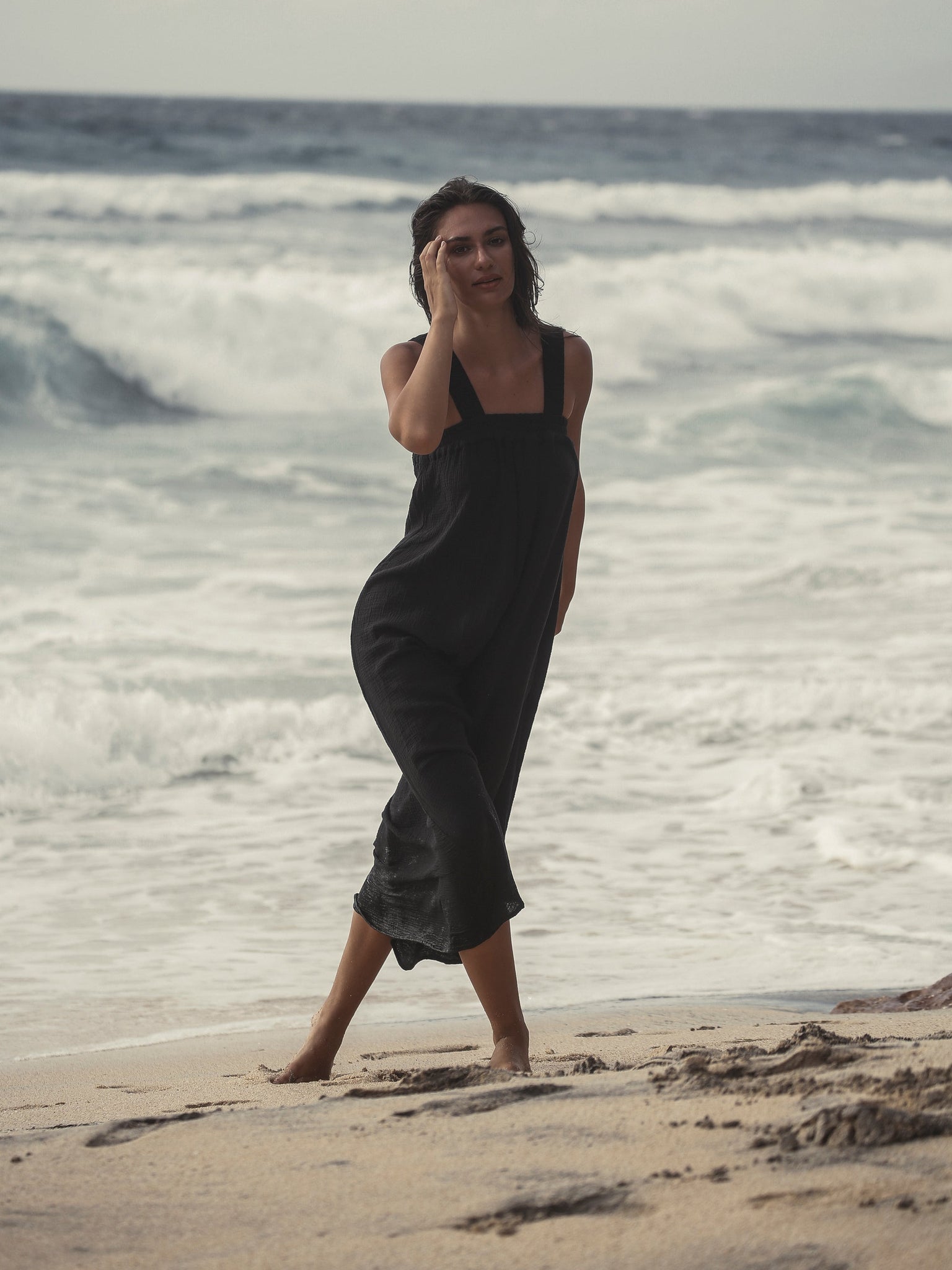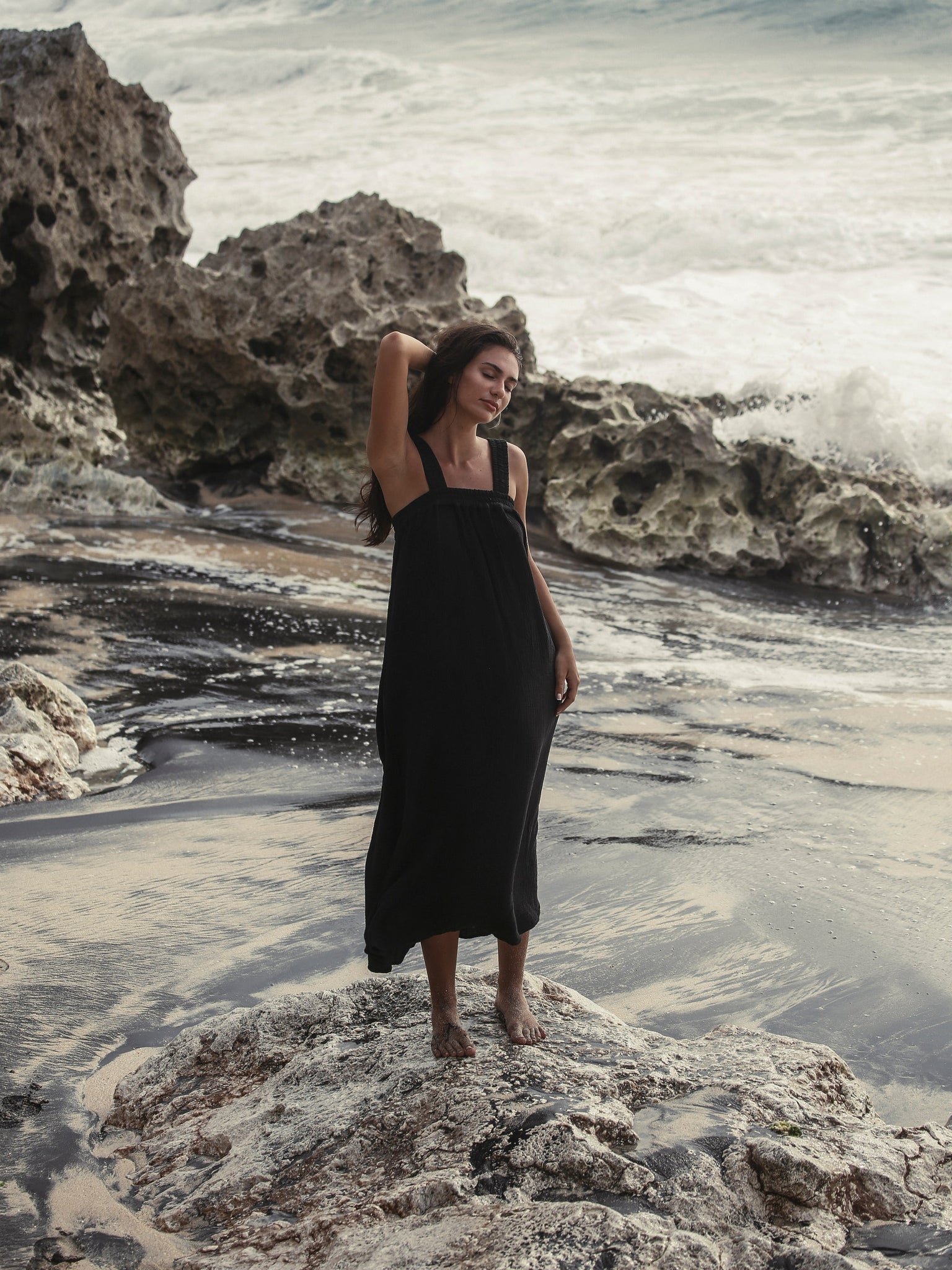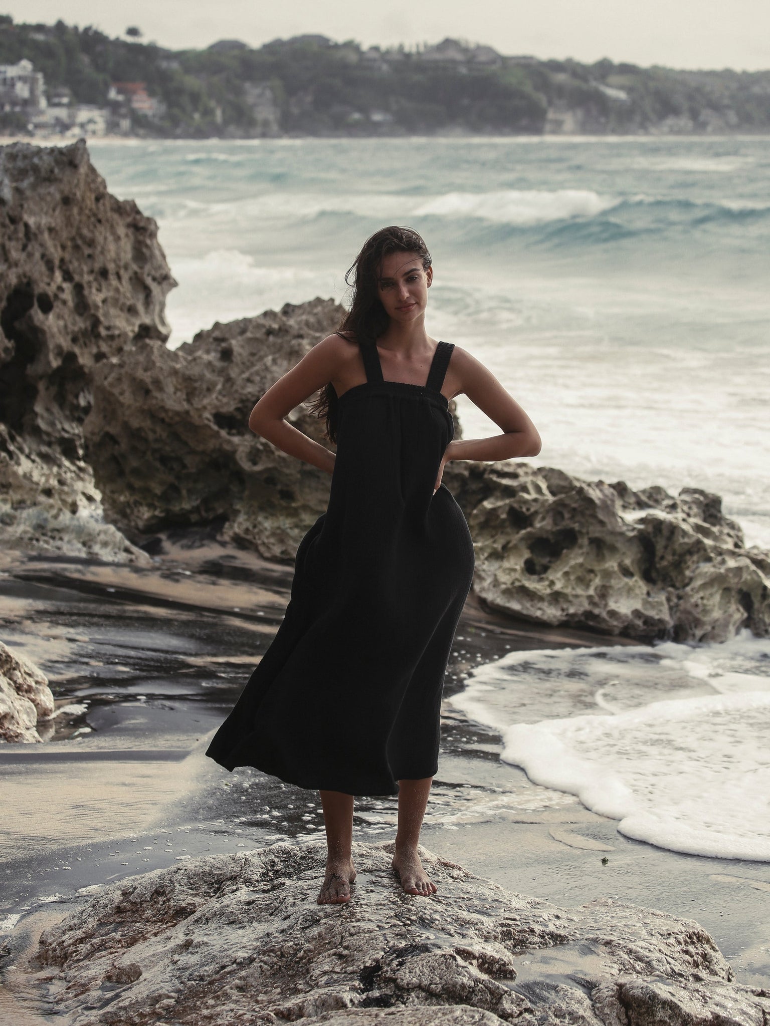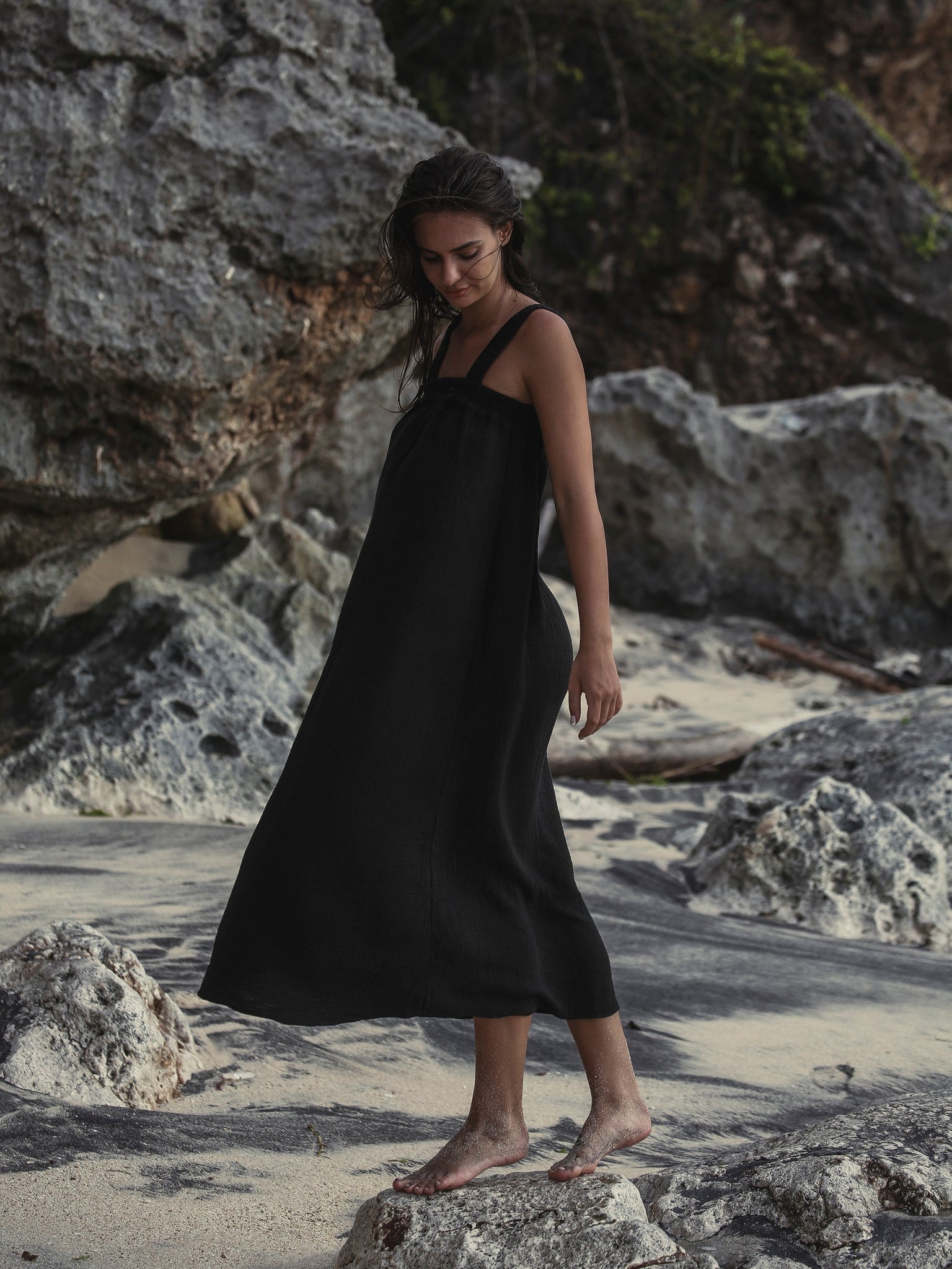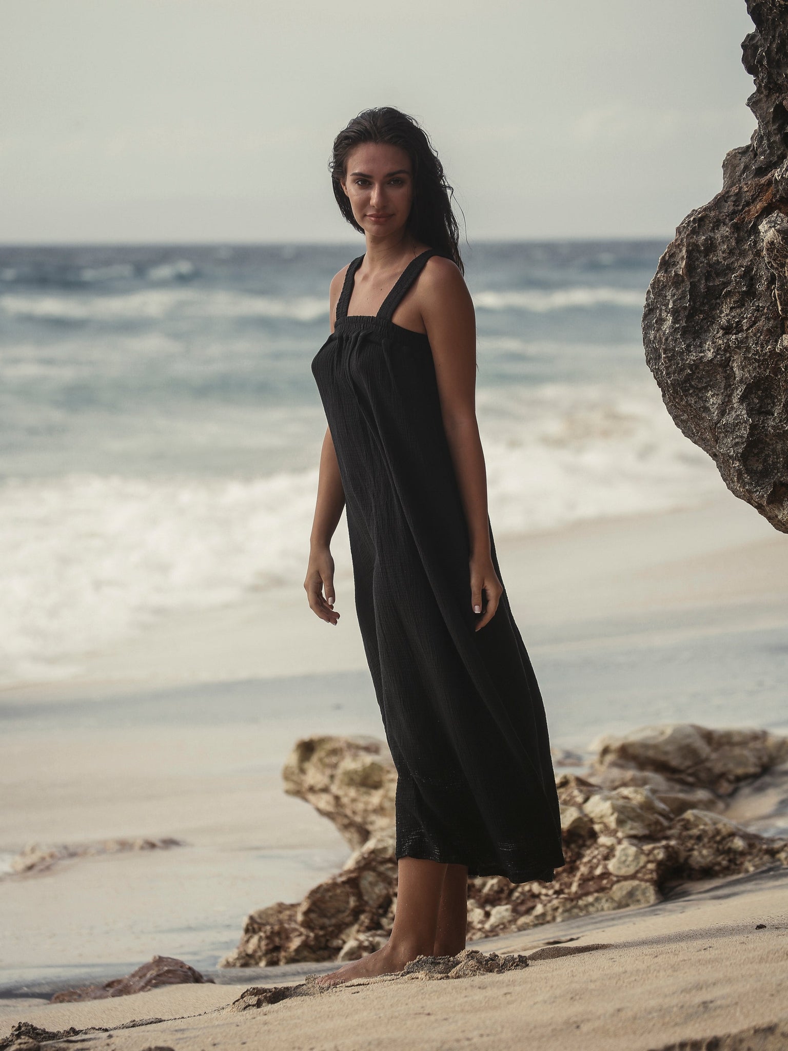 Noa Maxi Dress Black with an elasticated shoulder straps detail, offers a boho-inspired silhouette. Structured squared elasticated neckline is essential for this season’s Spring wardrobe which can take you through week to weekender. Soft and swingy Maxi dress focus on sustainability through traditional touches empowering local artisans in the remote villages of Turkey.