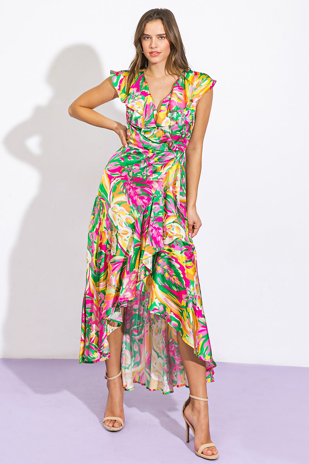 A printed woven satin maxi dress featuring surplice neckline with ruffles, front hi-lo faux wrap skirt with ruffled hemline and side zipper closure