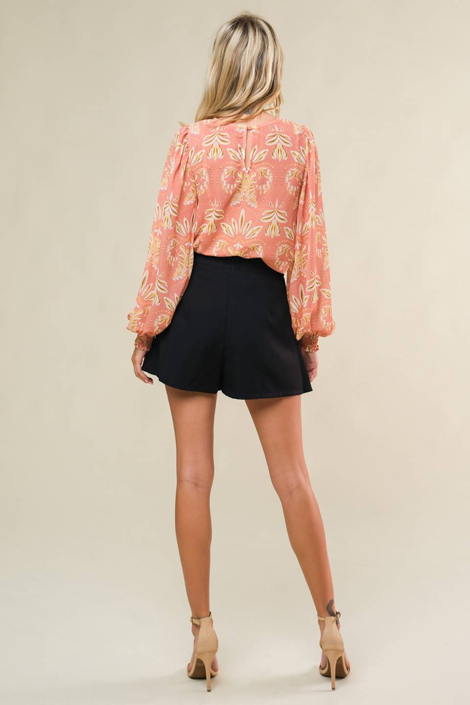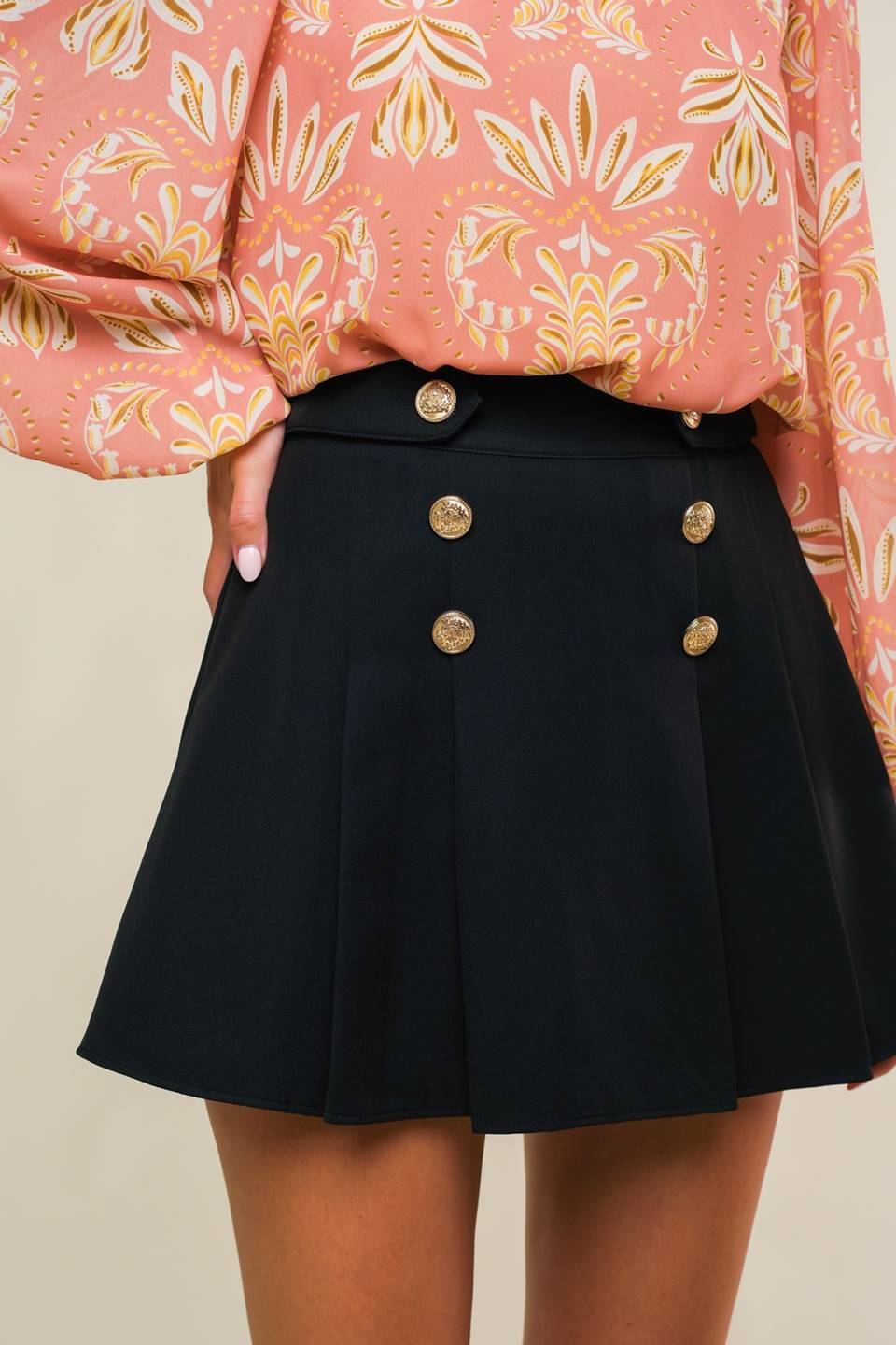A solid woven skort with front pleats, button detail and back zipper closure