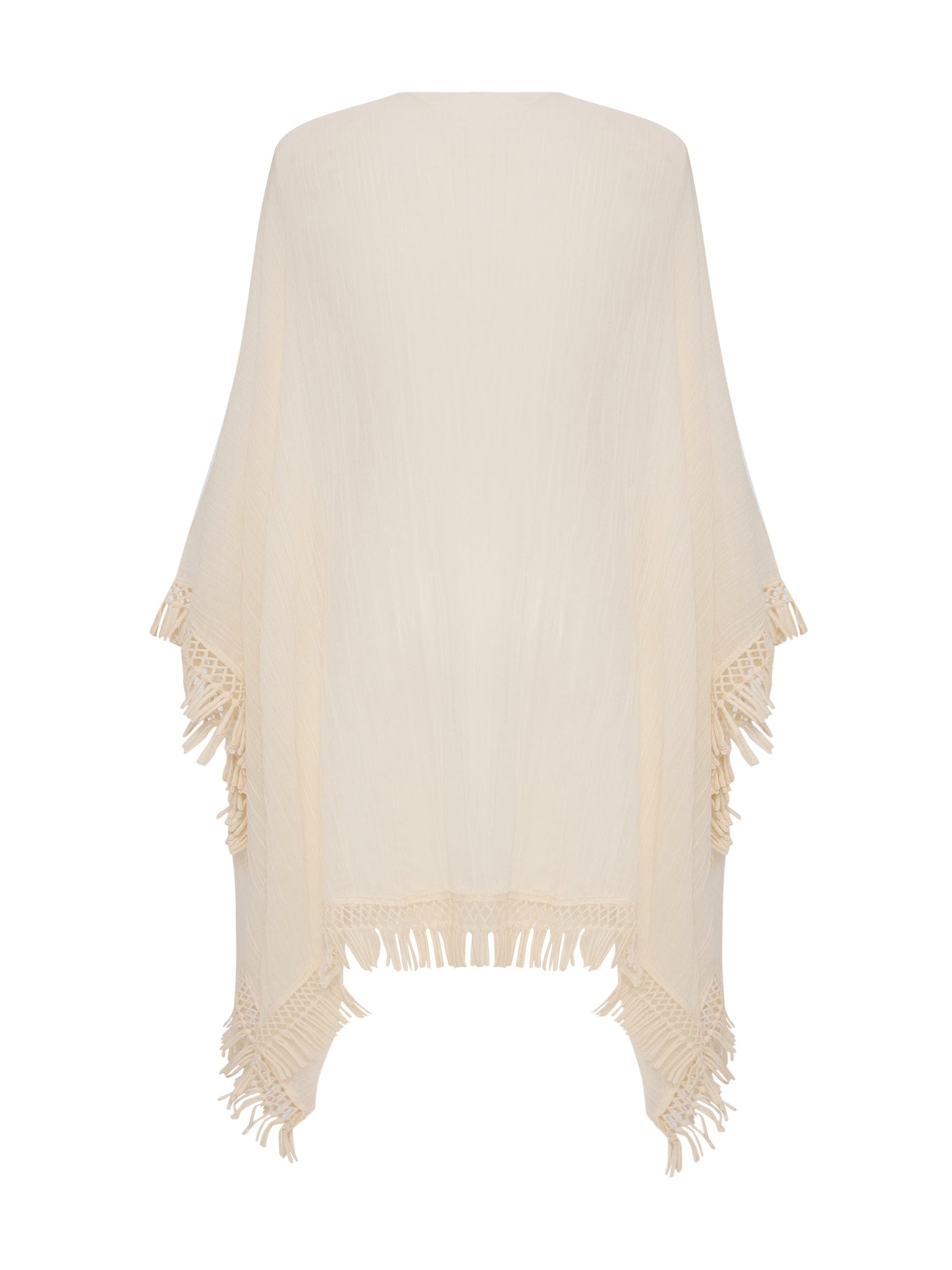 This kimono embodies effortless elegance with its sheer, lightweight texture and fluid silhouette. Designed with an open front and delicate fringe detailing, it offers a breezy sophistication that moves beautifully with every step. Perfect for layering, this versatile piece transitions seamlessly from sun-drenched beach days to balmy evenings, adding a touch of refined bohemian charm to any look.