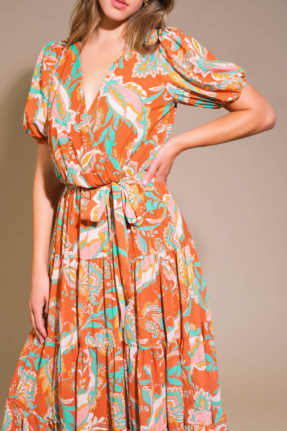 A printed woven midi dress featuring surplice neckline, short sleeve, elasticized waist with self sash tie and tiered skirt
